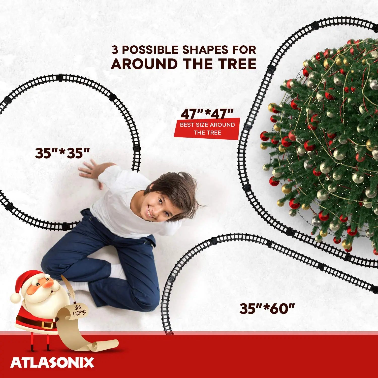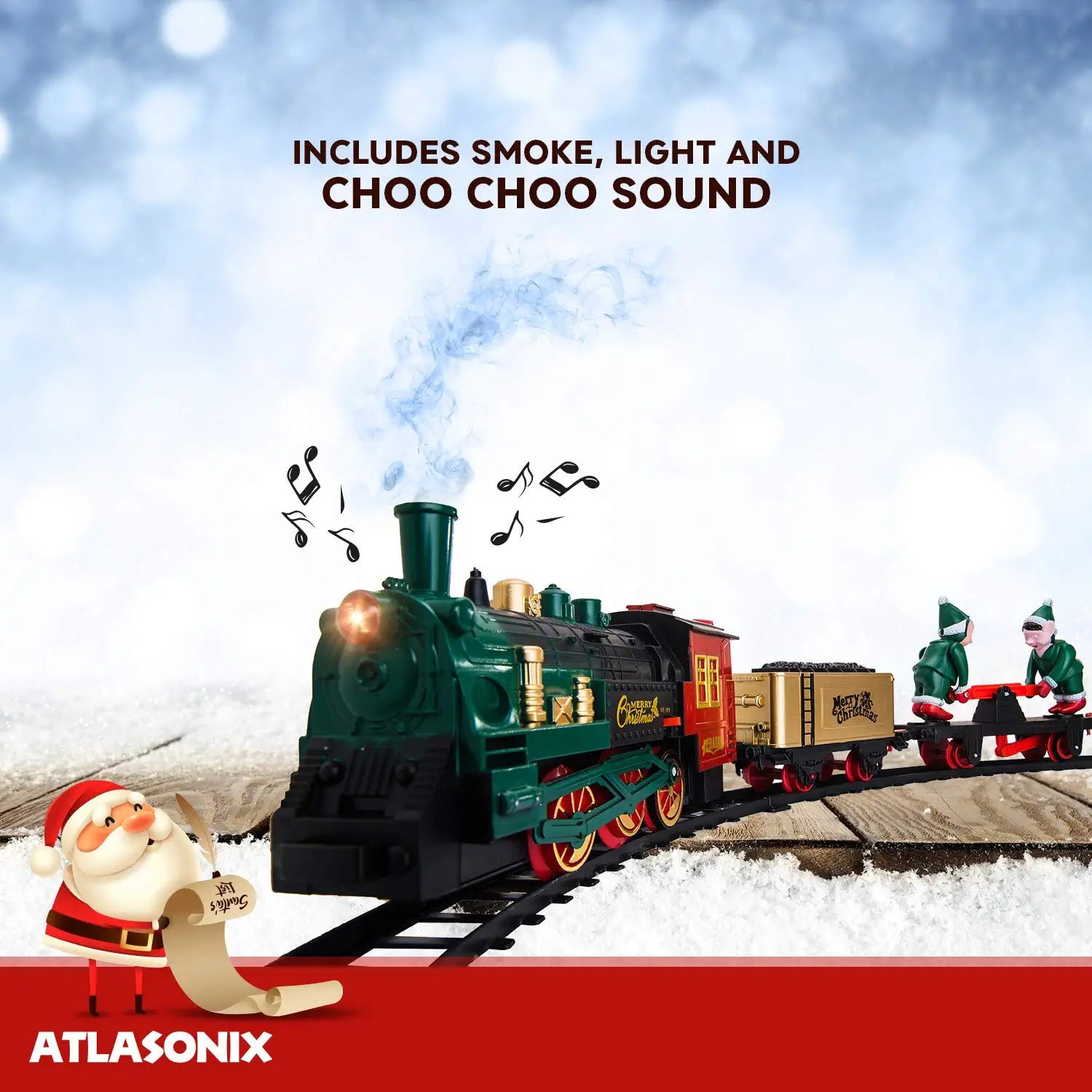 Atlasonix brings you a Christmas Tree Train Set Deluxe! Smoke, lights, the tooting horn, steam engine, train cars, and the hand-operated rail car with 2 of Santa’s Elves.